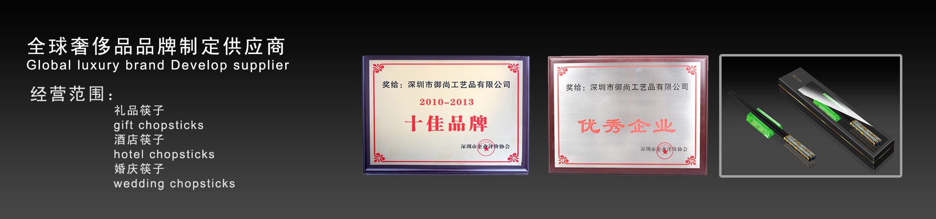 御尚健康產(chǎn)業(yè)(深圳)有限公司旗下御尚工藝筷子榮獲深圳市企業(yè)評價(jià)協(xié)會授予的2013年度“優(yōu)秀企業(yè)”和年度“十佳品牌獎(jiǎng)”稱號。 深圳市御尚工藝品前身為深圳市御尚工藝筷子廠,是御尚健康產(chǎn)業(yè)(深圳)有限公司和香港御尚實(shí)業(yè)有限公司全資子公司,是一家專業(yè)從事高檔筷子及紅木工藝品設(shè)計(jì),研發(fā)和銷售及生產(chǎn)為一體的專業(yè)供應(yīng)商,位...【更多詳情】
